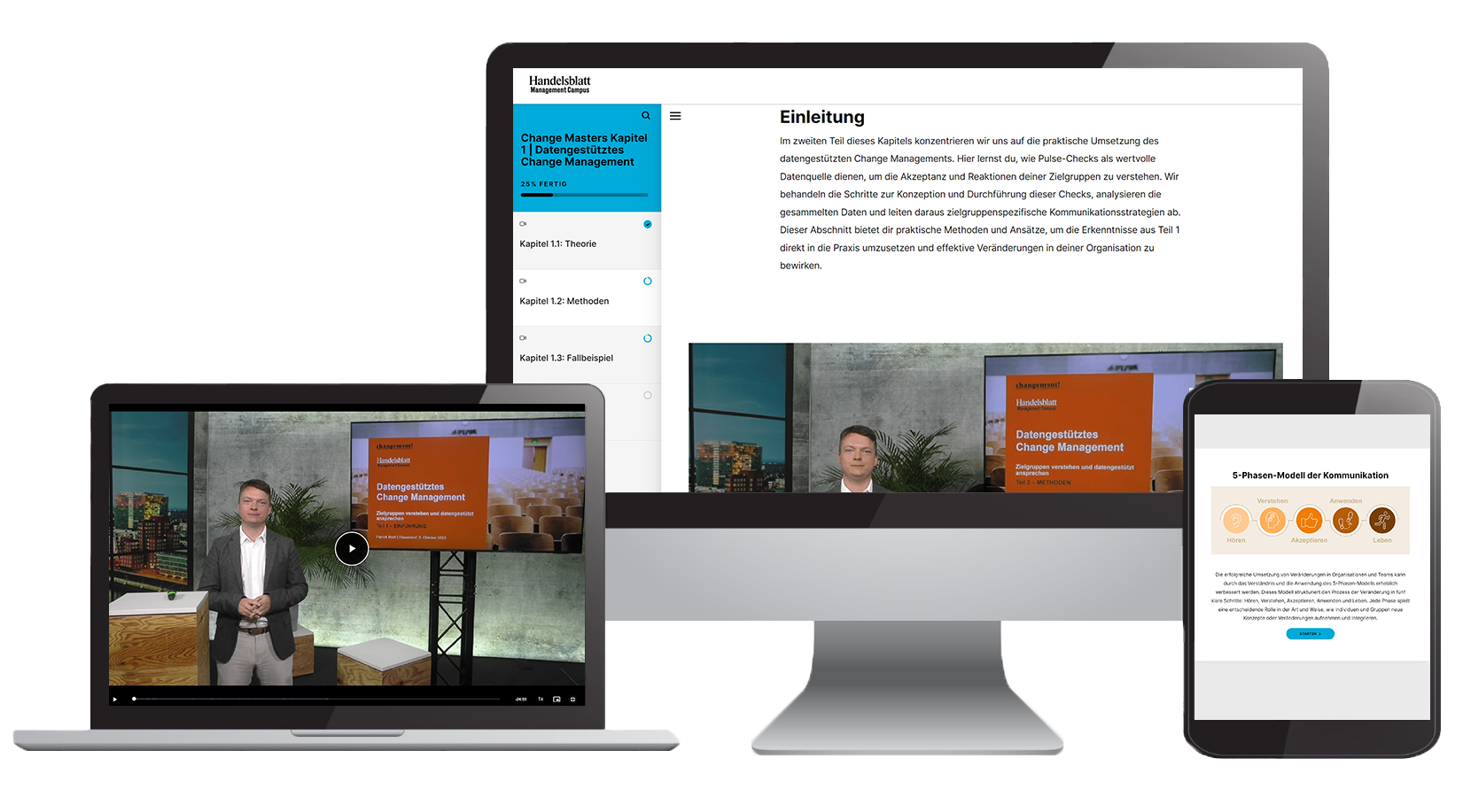 Lernen Sie neben fundiertem Hintergrundwissen nützliche Methoden für aktuelle Change-Projekte kennen und anwenden. Unsere Expert:innen vermitteln Ihnen anhand von Fallbeispielen aus deinen eigenen Unternehmen, wie Sie beispielsweise Strategien in Ihrem Bereich umsetzen und dabei flexibel reagieren können, wie Sie Technologien zum Wettbewerbsvorteil machen oder Daten für den Wandel nutzbar machen. Von der Planung bis zum Learning erhalten Sie dabei Einblick in Stolpersteine & Lösungswegen kennen, um Ihre Change-Projekte erfolgreich umzusetzen. In jeder Lektion erhalten Sie zusätzliches Material zum Downloaden und Ausprobieren.