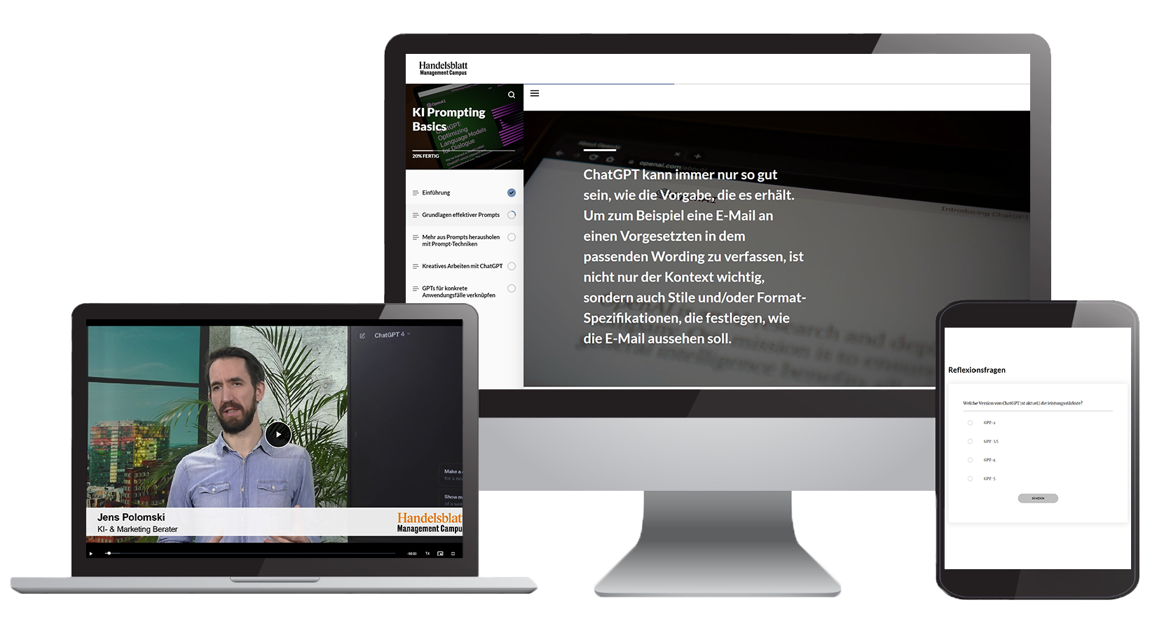 Steigern Sie Ihre Fähigkeiten im Umgang mit ChatGPT im Kompaktkurs 'KI Prompting Basics' - eine praxisnahe Einführung in die Welt des Promptings, geleitet vom KI-Experten Jens Polomski.